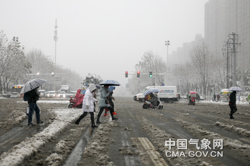 自1月3日12时起,安徽省合肥市自北向南陆续出现雨雪降温大风天气,合肥市气象台于1月3日21时将暴雪黄色预警提升为橙色,同时还发布了寒潮蓝色预警和道路结冰黄色预警。图为行人冒雪出行。中国气象报通讯员 唐晓东 摄影