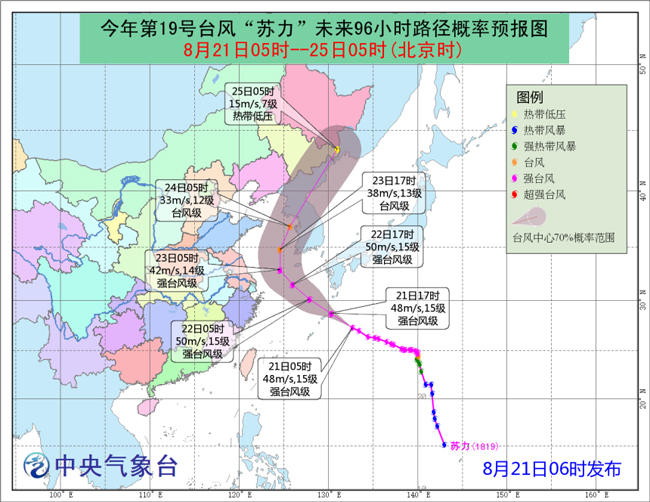 受其影响,21日08时至22日08时,东海东部海域的风力将逐渐加大到7~10级,部分海域风力可达11~12级,“苏力”中心经过的附近海域风力可达13~15级,阵风16级。中央气象台8月21日06时发布台风蓝色预警。
