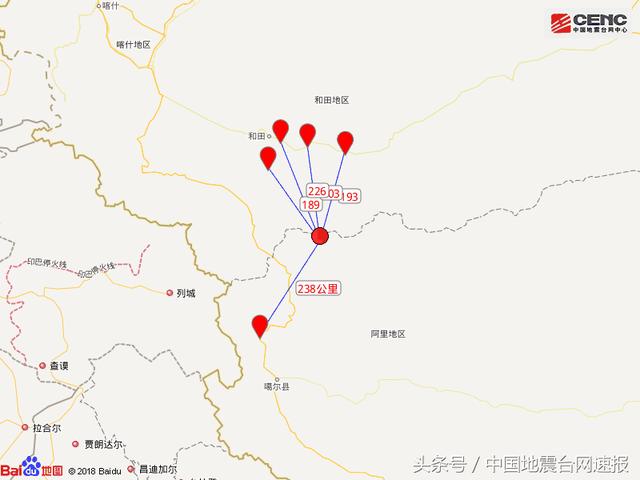 震中距和田县189公里、距于田县193公里、距策勒县203公里、距洛浦县226公里、距日土县238公里,距和田地区239公里,距乌鲁木齐市1109公里。