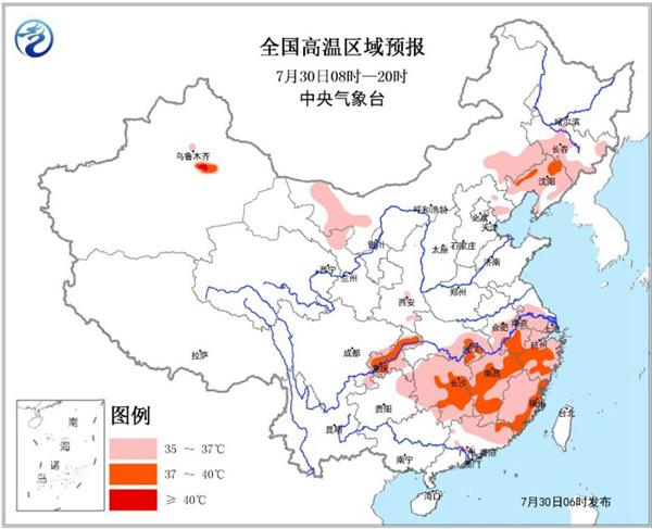 7月底前,南方大部仍多高温闷热天气,火力不减。中央气象台今晨6时继续发布高温黄色预警,预计7月30日白天,四川东部、重庆、江汉南部、江淮南部、江南、华南东北部及新疆吐鲁番盆地、内蒙古西部和东南部、东北地区中南部等地最高气温有35~36℃,其中,重庆北部和中西部、湖北东部、湖南东部、江西大部、浙江中南部、安徽南部、福建东部、辽宁北部以及吐鲁番盆地等地的部分地区最高气温37~39℃,局地可达40℃。