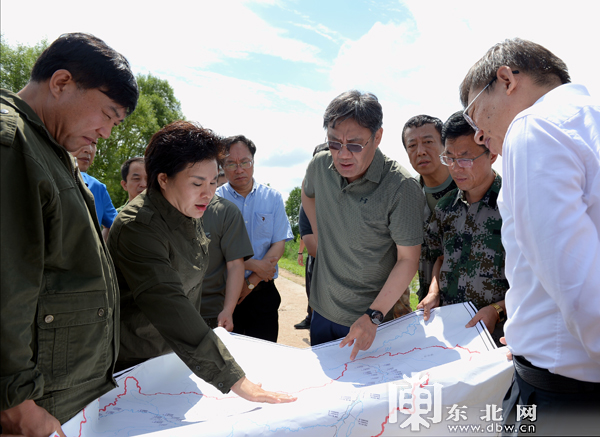 王文涛在通向保马农场被水毁的林企公路前与省直有关部门、伊春市负责同志会商水情。孙强摄