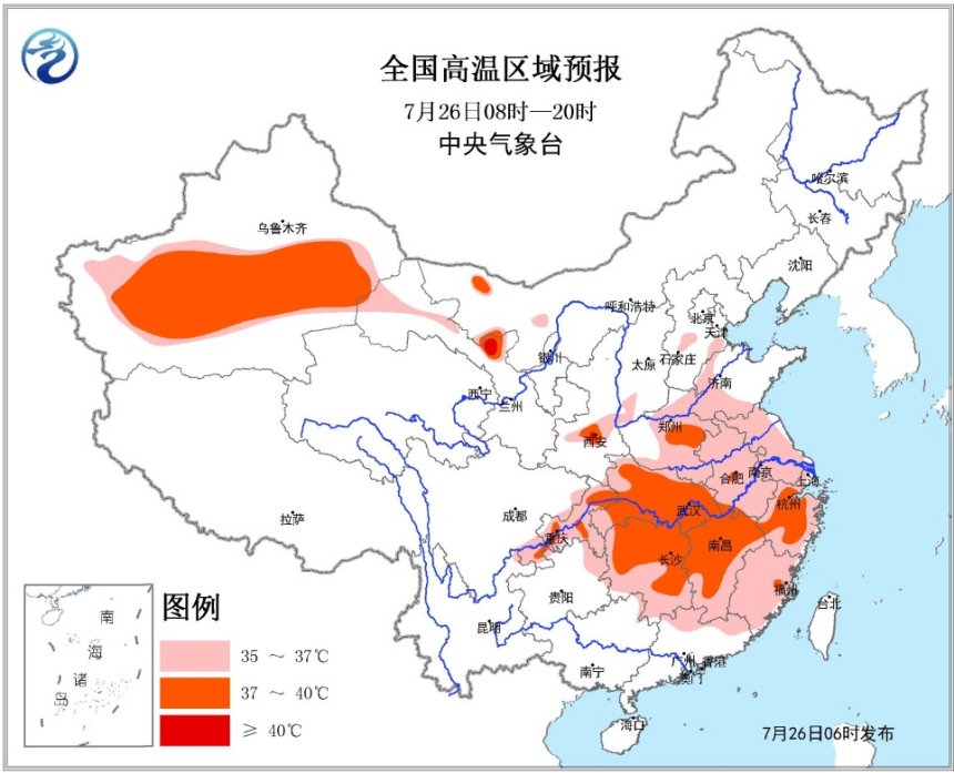 中央气象台7月26日06时继续发布高温黄色预警:预计7月26日白天,新疆南疆盆地、内蒙古西部、甘肃中部、陕西关中、华北南部、黄淮、江淮、江汉、江南、重庆、广东北部等地最高气温有35~36℃,其中,陕西关中、河南东部、湖北、湖南北部、江西中北部、浙江、重庆西南部和东部、内蒙古西部、甘肃中部、新疆南疆盆地等地的部分地区最高气温可达37~39℃,局地40℃以上。