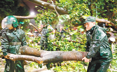 9月17日凌晨,广东省中山市多处道路被台风吹倒的大树阻断,武警广东总队中山支队的官兵彻夜奋战、清理路障。边树军 曹峰 摄影报道(人民视觉)