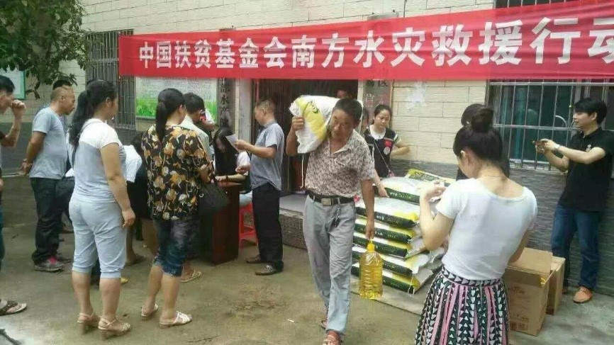8月1日—7日,中国扶贫基金会人道救援成员盘县社会义工联合会于湖北省红安县13个乡镇发放3000个家庭保障箱、42086件特步服装、810件美特斯邦威服装、1000床棉被;同期,其成员彩虹公益社于湖北省大悟县8个乡镇发放8202个家庭保障箱。