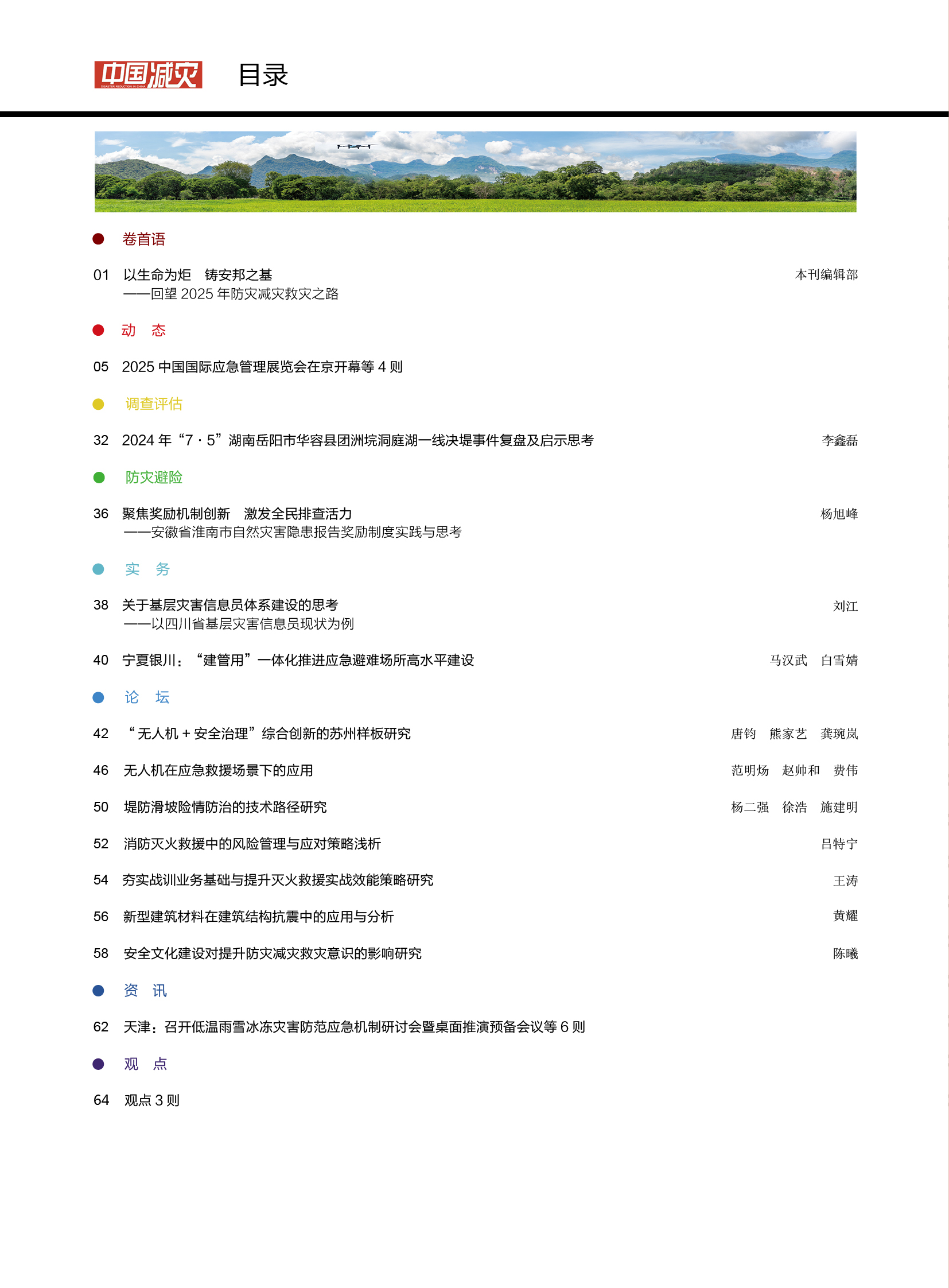 众志成城,微光成炬。2025 年,我们在灾害中见证了同心协力的中国力量:应急救援队伍闻令而动、向险而行,在浓烟烈火和洪峰浪尖中逆行,用钢铁之躯托举生的希望;基层工作者扎根一线、默默坚守,排查隐患、传递预警、转移群众,用脚步丈量责任,用坚守温暖人心;社会各界守望相助、和衷共济,企业捐资捐物驰援灾区,志愿者挺身而出贡献力量,普通民众自觉参与防灾演练,形成了“政府主导、社会参与、全民共治”的生动局面。无论是受灾群众安置点里的“暖心保障”,还是灾后重建家园里的“向阳而生”,每一个感人瞬间都诠释了众志成城、共克时艰的精神伟力。